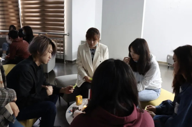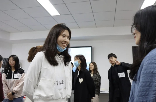 同学们通过问卷对自己的焦虑程度进行打分,高低分两组同学形成面对面的双环队形,通过几个奇思妙想的话题迅速了解彼此,一次次的人员换动如友谊车轮的滚动,让每个人都有更多交流机会。