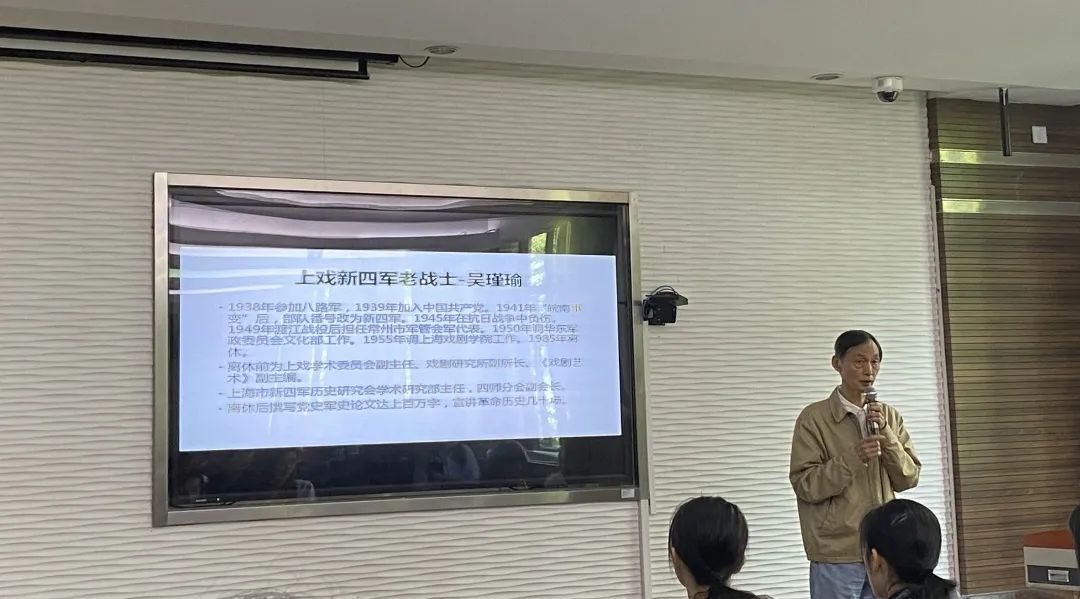 吴保和老师以一封写给习近平总书记的一封信开始,接着介绍了,上海市新四军历史研究会。吴谨言先生1938年加入八路军,1939年加入中国共产党,离休后也在上戏为教育事业谋发展,可谓一生都在为中国共产党服务,让学生们特别敬佩。