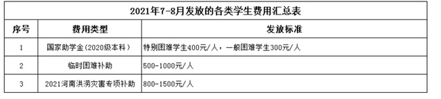 学生处在2021年7-8月通过建设银行学费卡打卡的方式发放以下学生费用: