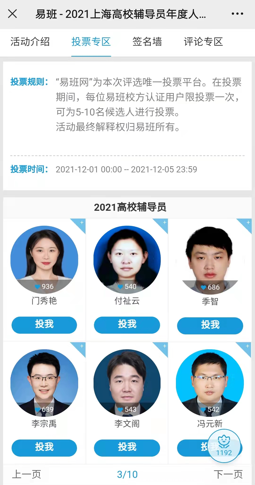 2、点击首页第一张图“上海高校辅导员年度评选”,点击投票专区,李宗禹老师在第三页左下角;