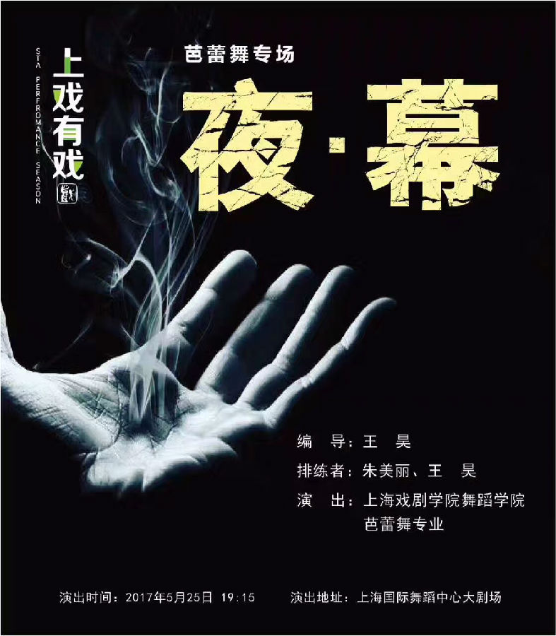 2016525日,上戏有戏芭蕾舞专场演出在上海国际舞蹈中心大剧场如期拉开帷幕,此次芭蕾舞专场演出由上海戏剧学院舞蹈学院参演,表演者为芭蕾舞表演方向的学生,演出分上下两场,分别为《雷蒙达》片段,及原创作品《夜·幕》。其中,由王昊老师编导,同朱美丽老师共同排练的原创现代芭蕾作品《夜·幕》曾在刚举行的2017上海市新人新作展演中获得新作奖。