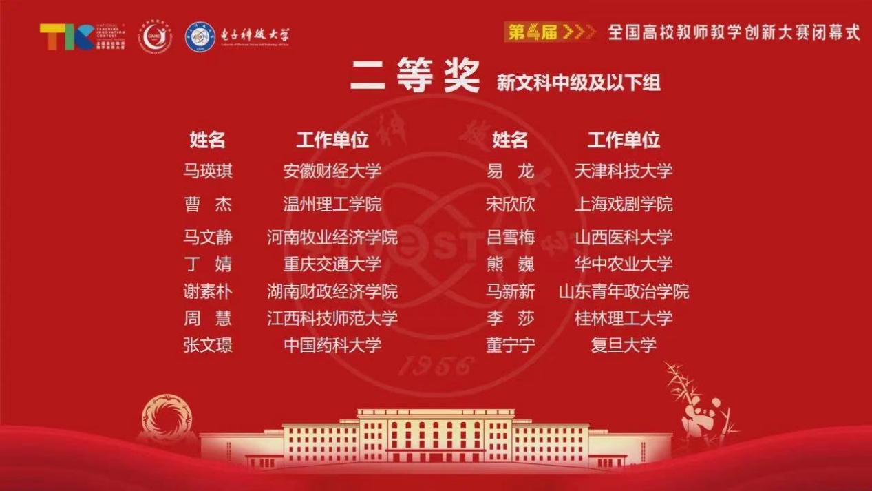 7月27日-31日,由教育部高等教育司指导,中国高等教育学会主办的第四届全国高校教师教学创新大赛在成都电子科技大学举行。我院教师宋欣欣获新文科中级及以下组二等奖,汇报主题为“脑眼心手,跨界融合,多元驱动,关联社会——新文科视域下舞蹈创作思维开发式课堂的创设与实践”。