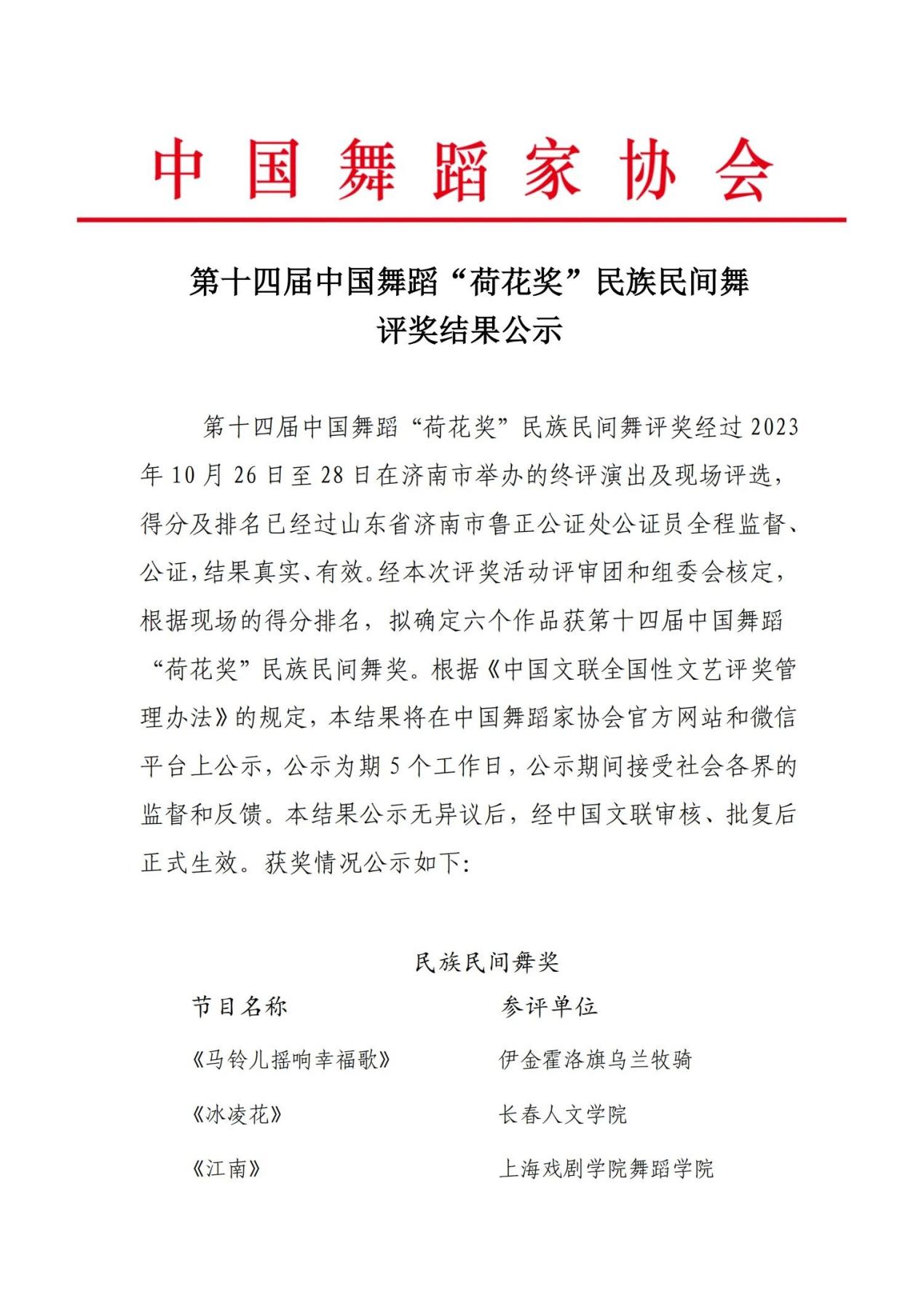 近日,中国舞蹈家协会公示了第十四届中国舞蹈“荷花奖”民族民间舞评奖结果。上海戏剧学院舞蹈学院原创作品《江南》位居前列。