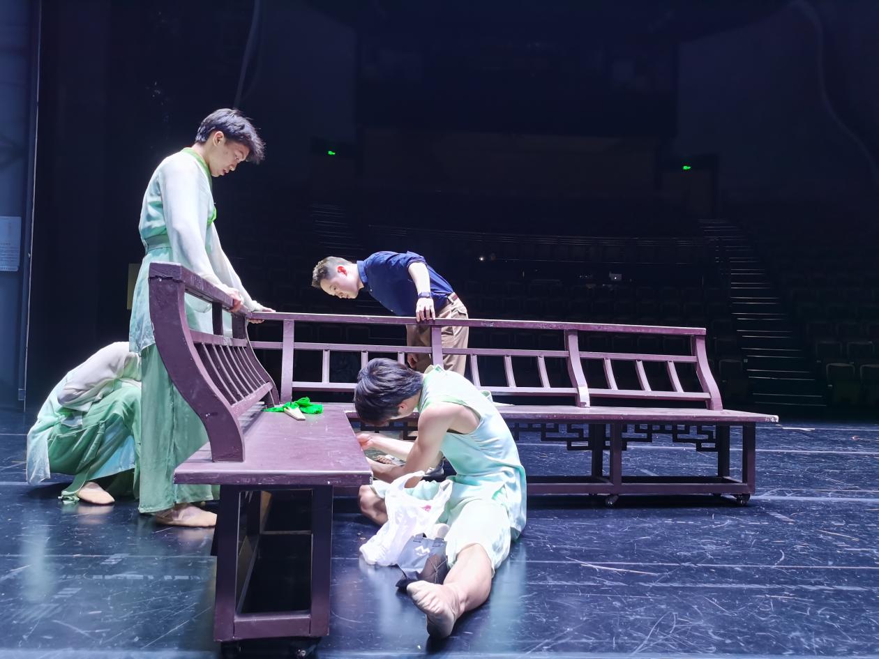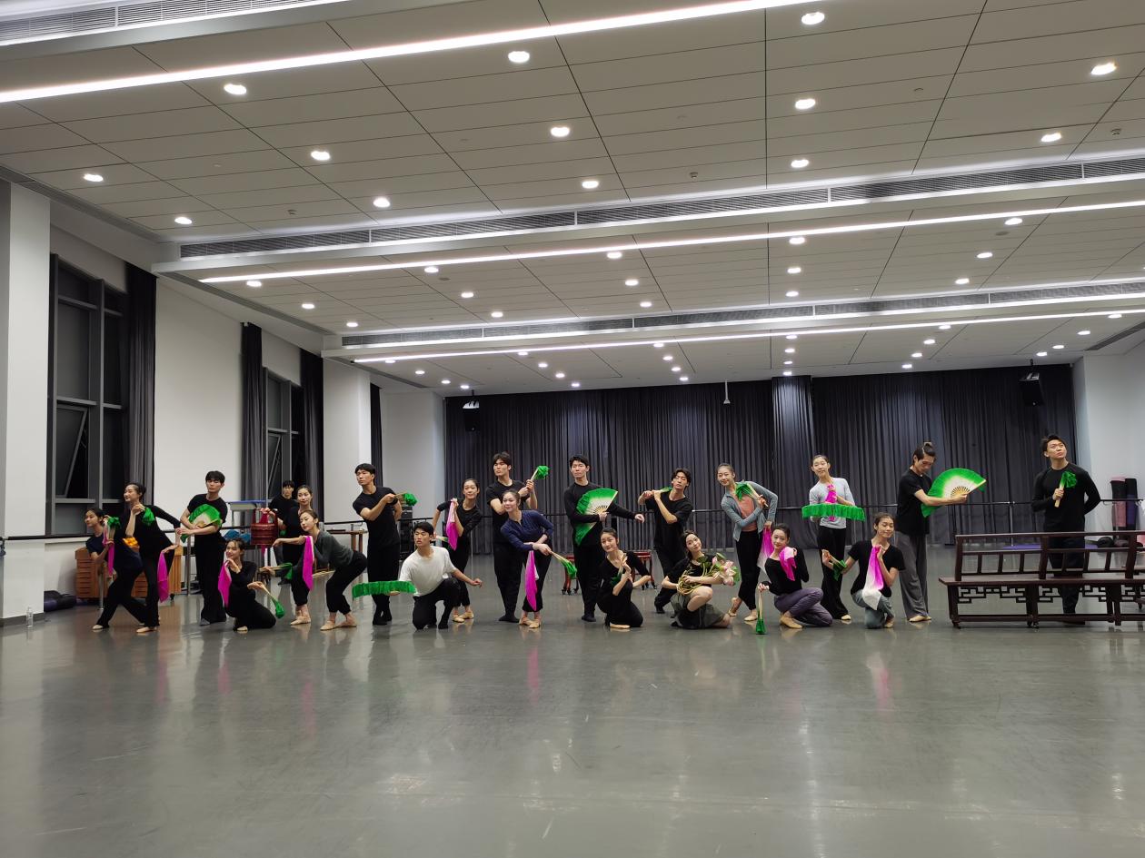 在正式进入创作之前,两位编导带领着学生一起学习江南舞蹈元素,编导说“整整两周时间,我们从早到晚只做这一件事。要把江南跳到骨子里去,必须掌握这种风格,在后续的创作和表演中才能得心应手。”因为江南元素并非教学大纲内的内容,要传神地表现出江南元素小巧克制、一步三颤、软糯随动的韵味,必须依靠大量的打磨。