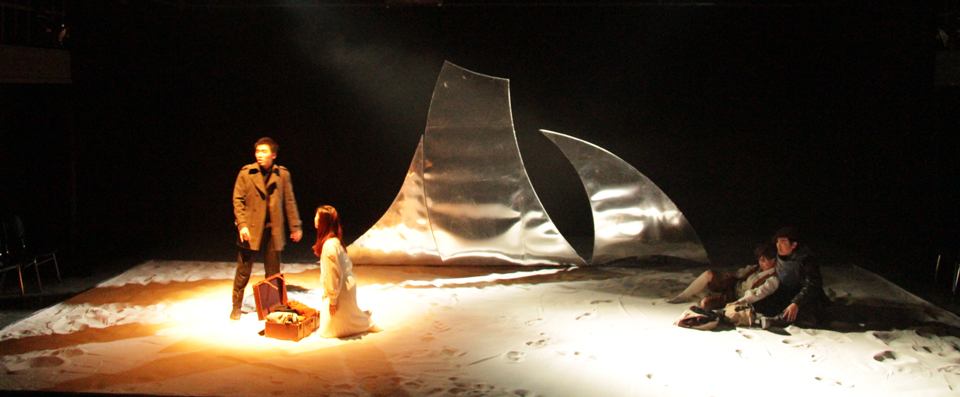 沙滩的想法最初来源于巴特尔先生,他告诉我们他曾经用盐在舞台上营造雪地的效果,而我们当时立刻否定了这个在黑匣子用白色的盐的疯狂的想法,如此大面积的盐在各种条件的约束下都无法实现。然而当我们决定将镜面制做成帆船的形状时,美妙的白色沙滩的想法就开始不断纠缠着我们:一艘在海上行驶的船——这将会形成多么奇异的景象!艺术的魅力就在于“将不可能变为可能”,所以我们决定在舞台上还原真实的沙滩景观。在几十个同学的努力下,3吨重的白色石英砂被运到位于红楼四楼的黑匣子剧场,倾倒在一个四米宽,九米长的木框里,舞台立刻变成了一个巨大的沙盒游乐园,当蓝色的灯光和黄色的灯光照射到高低起伏的白沙上时,形成了一副海浪拍打沙滩的唯美景象。