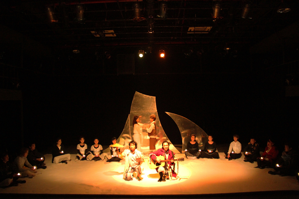 白色的沙子不但填补了舞台上前区的空白,也影响了导演对戏的编排。沙子加强了表演与地面的交集,所以,椅子、桌子等道具即被省略,演员可以直接坐在沙子上,犹如在海滩上休憩一样,在服装设计上,鞋子也被去除,演员们就像在沙滩上玩耍,我们觉得这也影响了演员们的心情,让他们更有活力和激情去表演。同时,剧中伊利利亚这个海边城市的风貌也由这片沙滩交代清楚,留给观众无限的想象空间。《第十二夜》的舞台也是四维的,在开场前,沙子是平坦的,随着演出的进行,演员在上面的活动留下脚印,沙滩的特点才渐渐呈现。所以舞台的地面是有机的、运动的,是一个随着演出进行的时时刻刻都在变化的过程。