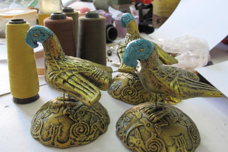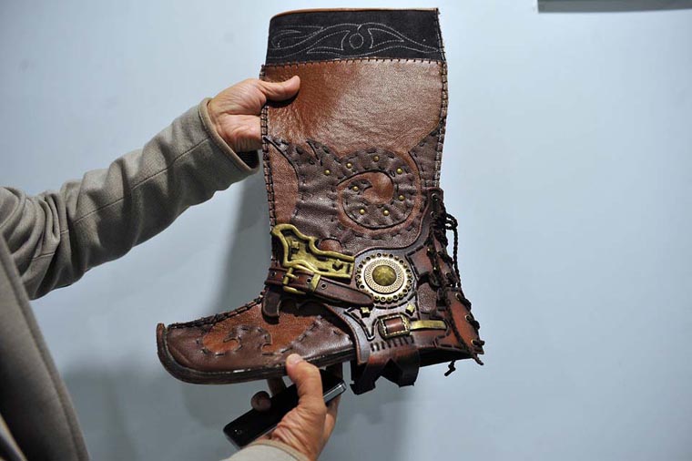 在整个设计与制作过程中,潘健华不断强调要根据历史考据对服装的款式、色彩、质感进行复原,注重匈奴群像的统一与变化:在材料的选择上,使用带有特种肌理的材质(或加工成有特殊肌理的材质),丰富服装细节的多样性;在串冑甲片、装饰织带上,则全部采用手工一针一线缝制、一根一条编织。特别是在所有服饰完成之后,潘健华更强调“做旧”的重要性,“不能新,一定要有匈奴军队千里驰骋的斑驳效果”。从而巧妙还原了匈奴服饰的特点。