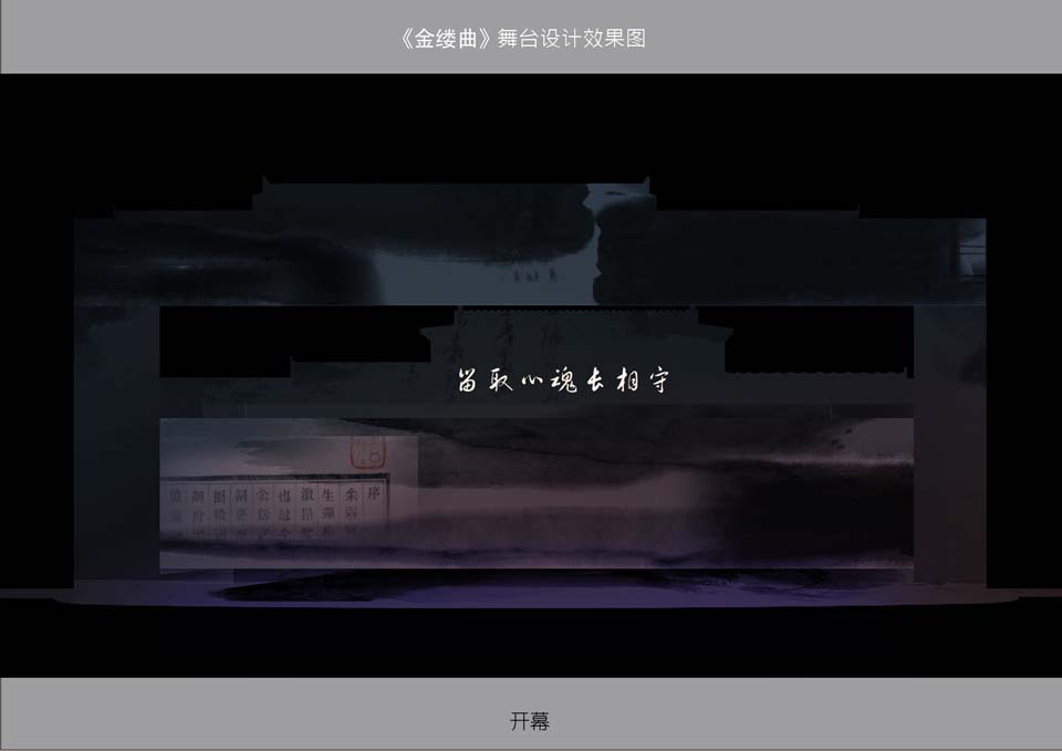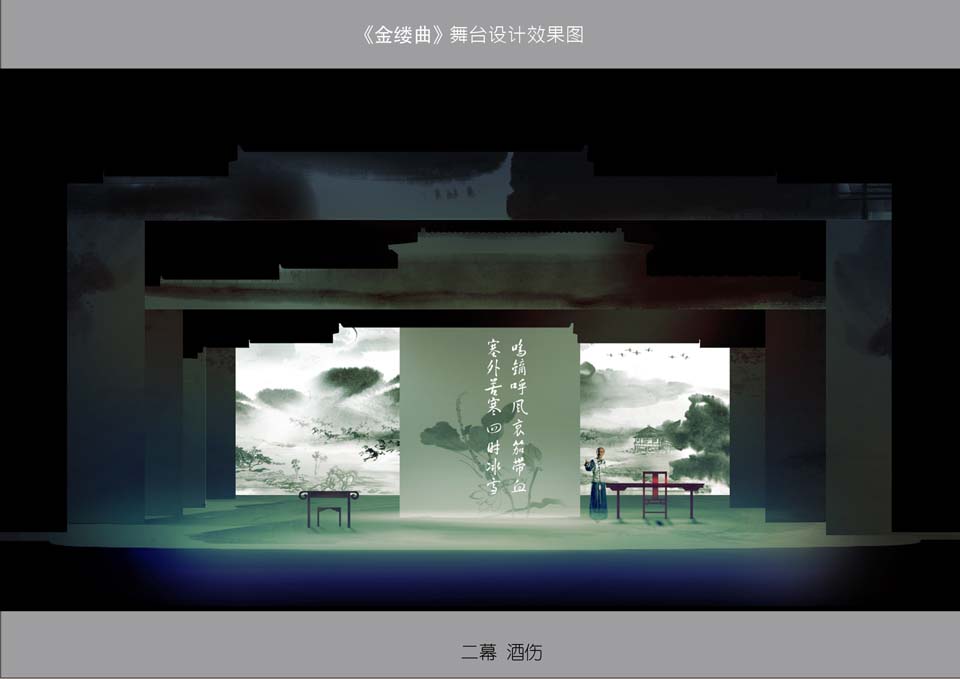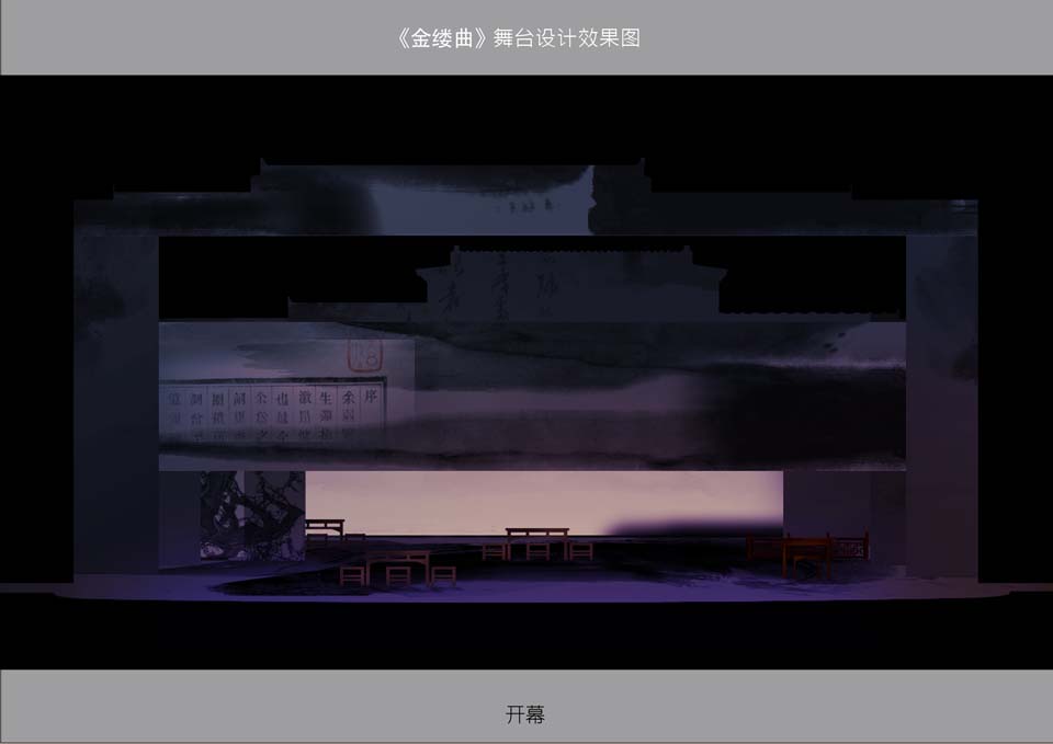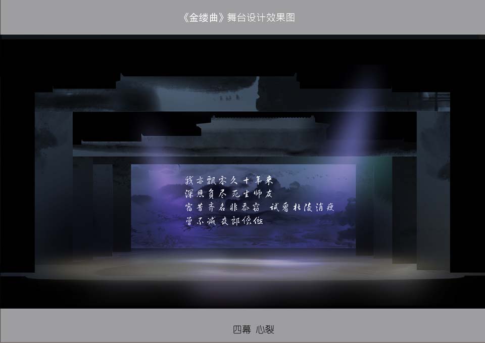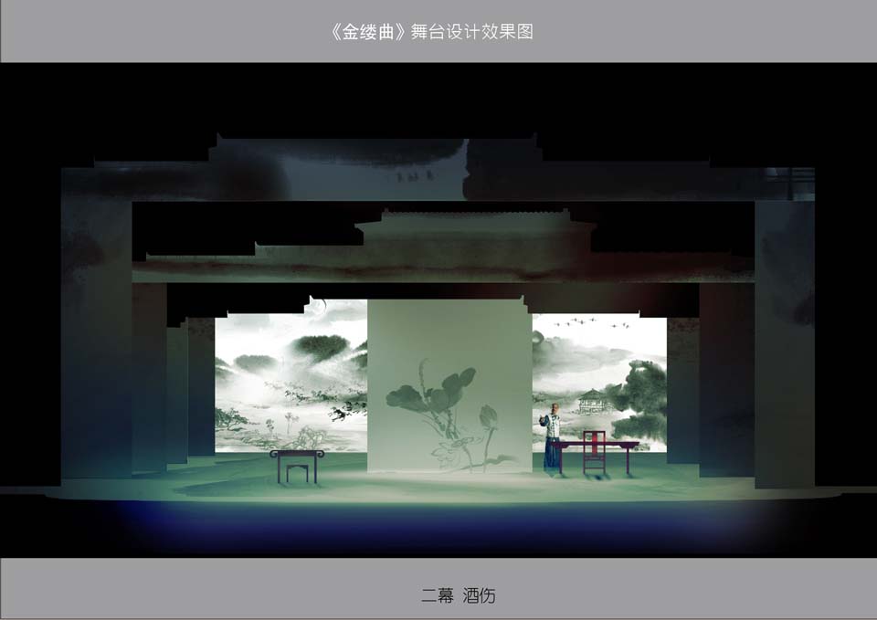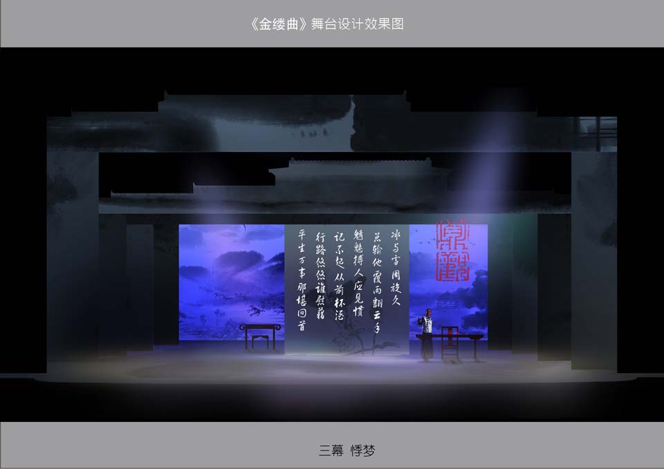此剧在多媒体的运用上,考虑到《金缕曲》剧本的需要,剧中会有一部分的唱词和书信的呈现,就采用了多媒体投影,将文字投射在水墨画的景片上,将文字与画完美结合,随着景片和文字的移动,就如观众在看一幅动态的水墨画。