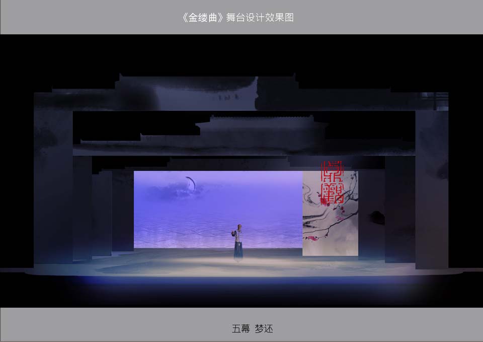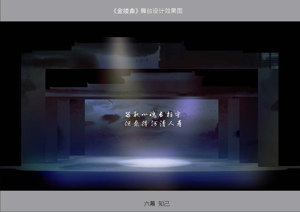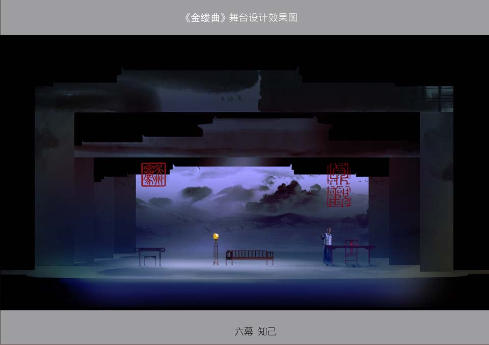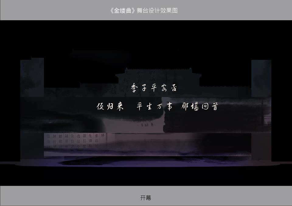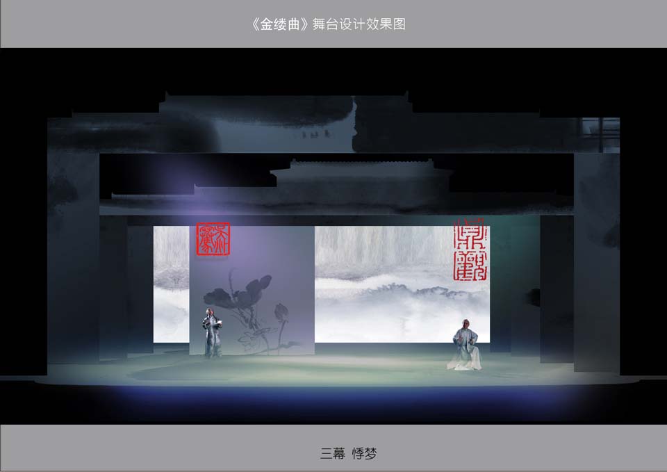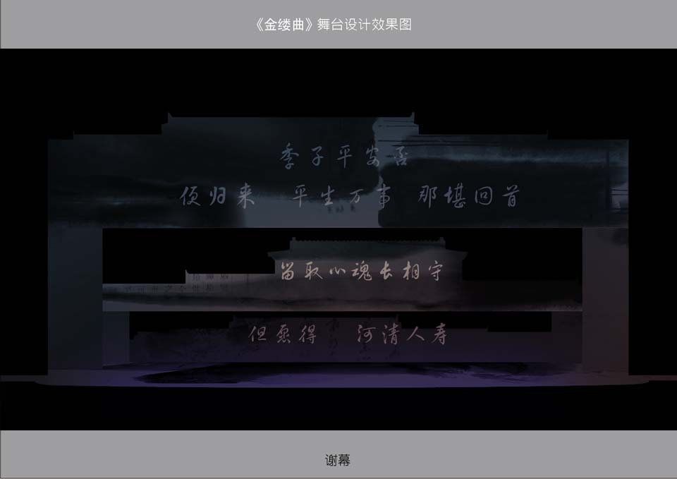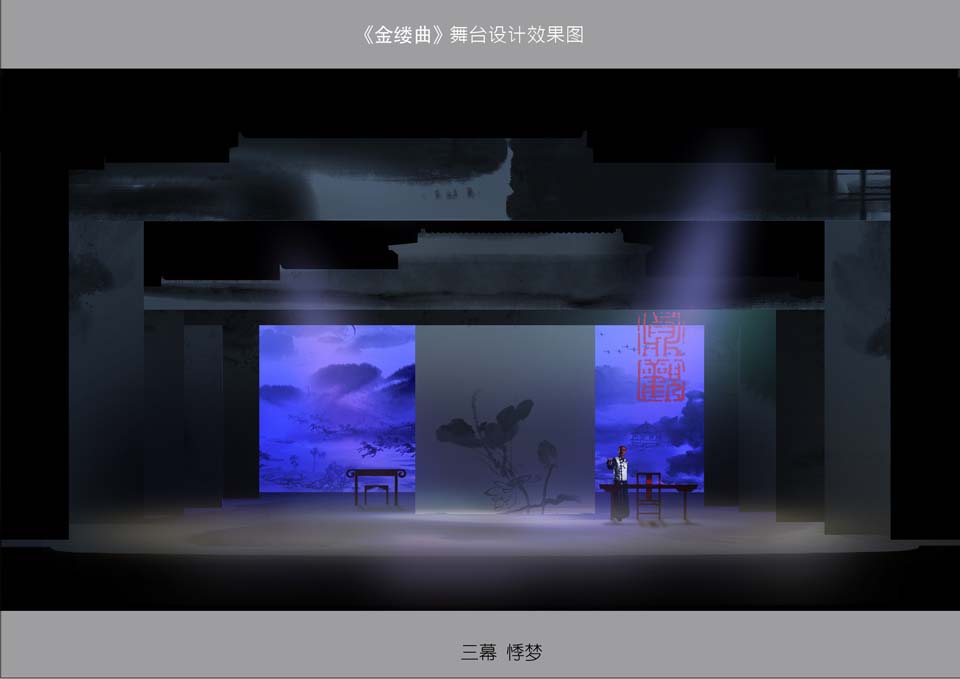 此剧在多媒体的运用上,考虑到《金缕曲》剧本的需要,剧中会有一部分的唱词和书信的呈现,就采用了多媒体投影,将文字投射在水墨画的景片上,将文字与画完美结合,随着景片和文字的移动,就如观众在看一幅动态的水墨画。