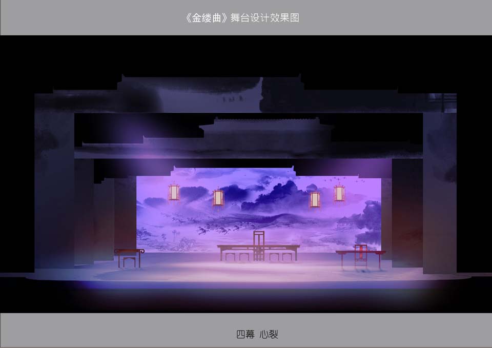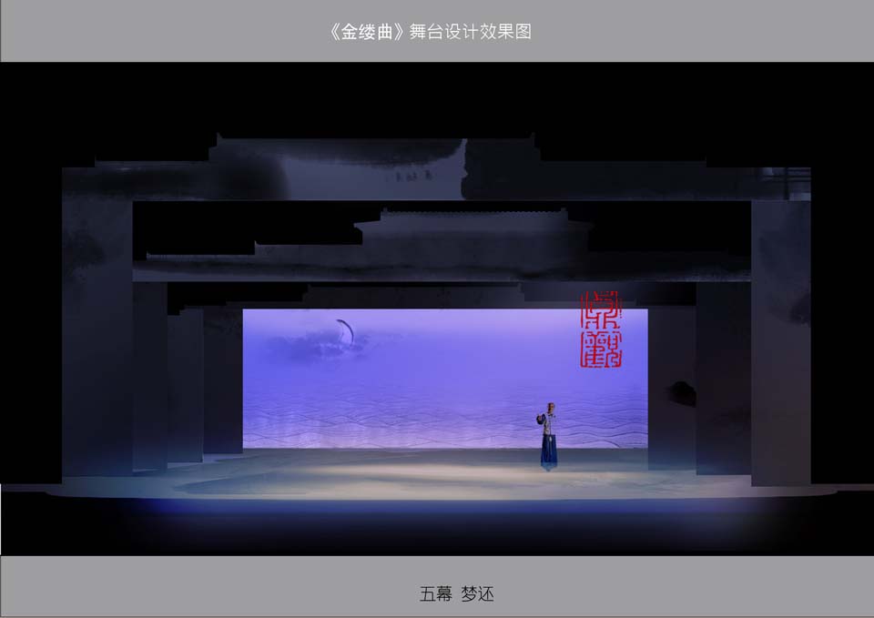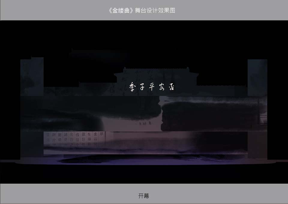 从最初我和韩生院长接到剧本,读完剧本,我期间也查找了许多关于剧中人物的生平资料和手迹,因为在做这个戏的舞美设计之前,必须要对这个戏的人物有深刻的了解,包括他所生活的年代,政治背景,人物性格特征等。根据导演的阐述,希望在舞美呈现上简洁大气,富有意境,而不是传统的写实性的京剧舞台。根据韩生院长的最初构想,舞美设计的最初理念就是充分利用沿幕和侧幕的组合变化,使整个舞台流动起来,既方便舞台的演员调度,也能使舞台形式多样化。在设计稿第一稿出来后,我们和导演进行了沟通,由于沿幕和侧幕都是比较写实的黑白线描的屋檐,包括每场景的设计上都过于具象,使得舞台元素过于繁杂而被否定。而后我和韩生院长又重新进行了构思,将舞台整体风格定位为水墨风格,通过不同灯光下墨色的浓淡,来呈现水色氤氲和晕染的效果,整体风格淡雅、清丽。每道沿幕上采用大面积的泼墨屋檐,加以顾贞观的书法手迹,每道沿幕前面设有一道京城屋檐的剪影,便于演出中室内景和室外景的转换,也打破了比较规整的舞台直线和横线构图,同时增强了舞台的纵深感。每道舞台沿幕都可以升降,在观众进场到序幕,几道沿幕高低错落,有悬挂于半空,也有落于地面,就像是京城远处的屋檐,一层叠一层,给人以威严压抑的感受。随着开场云姬琴声的响起,配合多媒体投影,沿幕才开始慢慢升起,露出一个空旷的舞台。舞台前区侧幕采用大面积的水墨笔触和书法,后区每道侧幕景片的形象,则是代表剧中四个人的性格特征,主角顾贞观采用荷花作为形象,荷花,出淤泥而不染,代表着高尚品德的人,也符合顾贞观清高的知识分子形象。吴兆骞以一棵枯枝作为代表形象,寒风中傲然凛立的枯枝,虽然坚强但又无助。纳兰明珠则是以一个盘根错节的大树干代表一位深谋远虑的老臣子。唯一剧中的女性角色云姬,采用柔和的墨线,点缀了少许带有一点色彩的花瓣,为整个黑白灰的水墨空间增加了一点情趣和色彩。代表四个人物的侧幕景片根据每场次的变化可以移动。比如在第二场顾贞观书房到纳兰明珠宴会厅的转场时,巧妙运用可移动的侧幕景片,在顾贞观书房的时候将代表顾贞观的侧幕条移到舞台中央,侧幕后面藏着4米长的宴会桌,当从书房转场的时候,将这道侧幕移开,就出现4米长的宴会桌,配合灯笼的下降,马上就将书房变为纳兰明珠的宴会厅。大大节省了迁场的时间。舞台的地面也同样处理成大笔触的水墨痕。整个舞台就是一个水墨的空间,也是一幅有意境的水墨画,随着演员的表演,水墨画呈现出不同的构图。舞台上还有两个主角的印章,顾贞观和吴兆骞,印章大小上略带点夸张,悬挂于舞台的左右两侧,两个印章在演出中或交替出现,或同时出现,就如一幅水墨画上重重的印上作者的印章。