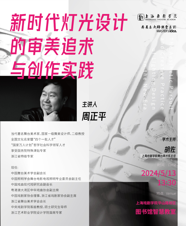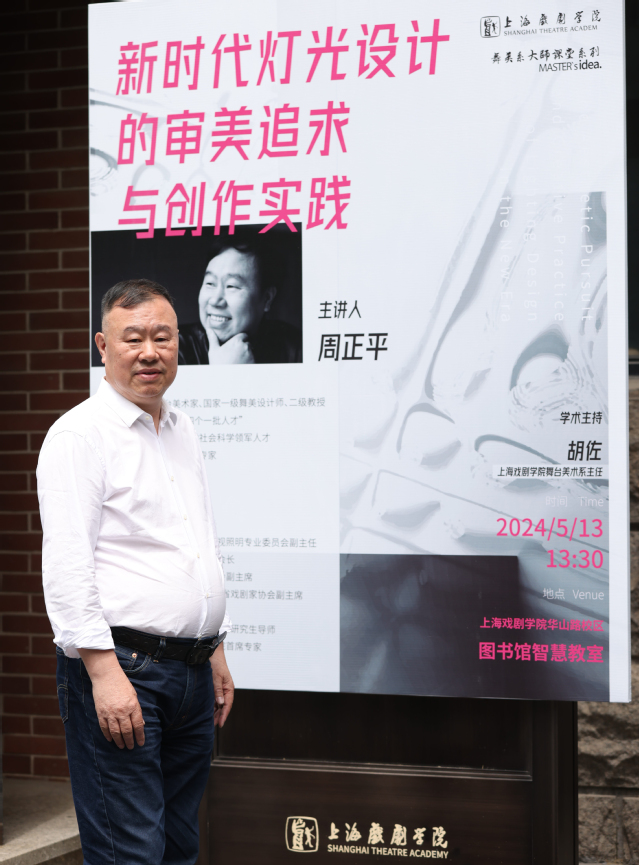 2024年5月13日下午,著名舞台美术家、国家一级舞美设计师周正平教授,在开云足球首页官网下载华山路校区图书馆一楼智慧教室为师生带来了《新时代灯光设计的审美追求与创作实践》学术讲座。