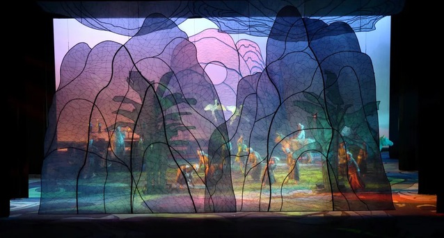张武老师的舞台设计将桂林山水的厚重,用金属构成山体的造型并蒙上纱,结合灯光控制,层层叠叠地构建舞台空间。