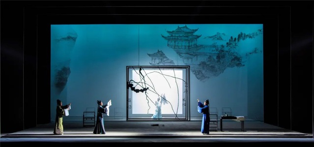 相比较昆剧的古朴厚重,胡佐教授在这部戏中设计精妙,镜子和书笺相互组合,不一定是一个具象空间,而是一个文化空间;在灯光方面,电脑灯投射文字,配合明暗控制,和人物表演勾联在一起,有符合戏曲特点,又不失现代性,同时富含中国元素。
