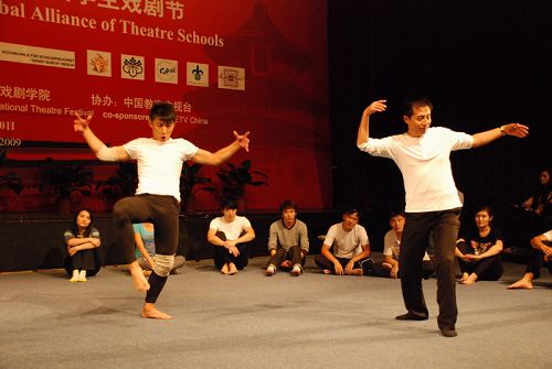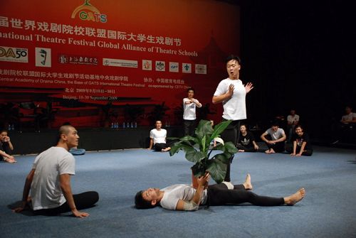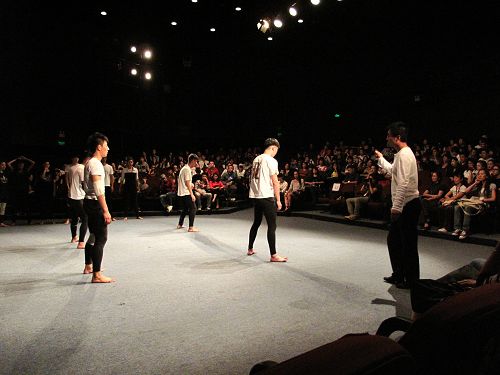 工作室第一部分中,何雁副教授首先让同学们由慢到快地进行一些强度体能训练,如打滚,后翻,旋转跳跃等。他强调直觉表演的重要性,告诉同学们不要防御自己。接着,邀请台下的三位同学做语言,声音和动作的转化练习,何雁副教授进行一一点评。当进入到两人一组即兴的表演时,现场的气氛达到第一个高潮。何雁要求同学们用非人类的语言进行交流,以达到语音和动作的转化,从而产生一定的戏剧效果。不论是国外同学还是国内的同学搭档,都发挥得很出色,获得现场观众的一致好评。