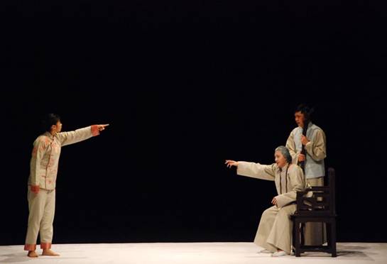 一张巨大的白布就是全部的舞台设计,简洁而不失意境,让人隐隐能够感到苍茫的原野,灯光、音效及简易门窗的运用为本剧增色不少。虽然导演将原剧本压缩了近一半,但当这出话剧呈现在我们眼前时并没有感到丢失了什么,反而在主旨方面有新的诠释。演员将人物内心世界的痛苦、矛盾、仇恨与挣扎发挥地淋漓尽致,把不同人物的复杂情感都清晰地展现了出来。最后,当焦母误杀了小黑子后,一抹血红的灯光打在舞台上,洁白的幕布被染得鲜红,演员激情的表演加上紧张激烈的音效将这出戏推向了最高潮。观众在感受到视觉冲击的同时,还有内心的震撼。