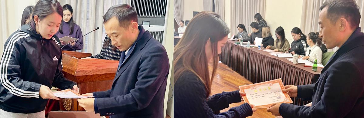 随后,活动进入最核心的环节——入党志愿书及发展对象培训班结业证书颁发仪式。《中国共产党入党志愿书》承载着每一位发展对象对党的庄严承诺,更凝聚着党组织的信任与殷切期望。现场气氛庄重而热烈,刘春友部长亲手将入党志愿书和结业证书递到每一位发展对象手中,学员们双手郑重接过这份政治信物,更意味着接过了一份终身的责任——此后每一次提笔创作、每一次登台亮相、每一次教书育人,都要以党员标准严格要求、校准方向,以更实的行动扛起信仰的重量,方能不负党组织的信任与嘱托。