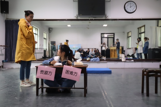 5分钟时间每组排出一个心理剧,要求是用哑剧的方式,可自选现场的道具,来呈现学习生活中遇到的困难和压力,设有主持人,困难方,资源方,每组成员都有自己的角色。同学们认真讨论,效率极高,可谓是惊喜连连。