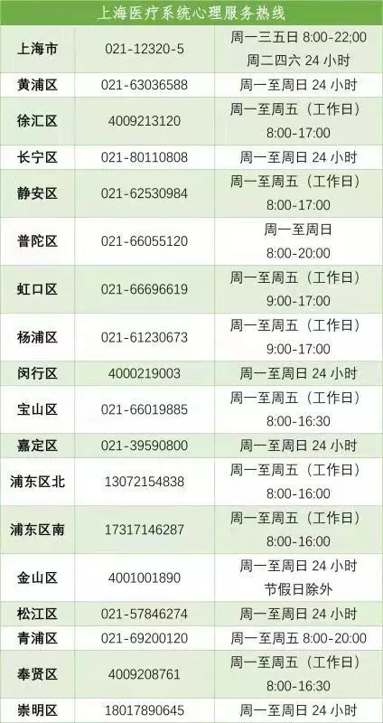 另,附上上海及全国医疗系统心理服务热线: