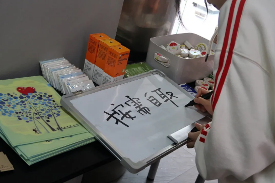 在集市的出口处,还默默放置着一个来自学工部的摊位。老师将压箱底的办公物捐出来,练字纸、铅笔、白板笔、卷尺……只要你要,只要我有,不需要参与交换就可以拿走。