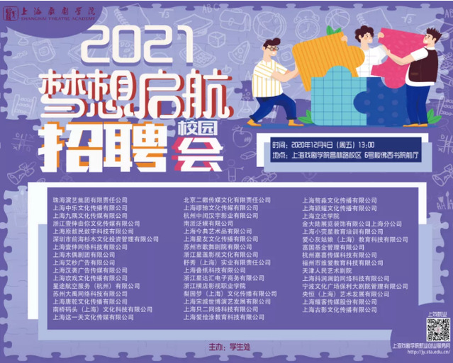 上海戏剧学院2021届毕业生秋季综合招聘会于12月4日下午在昌林路校区佛西书院前厅举行,本次招聘会也是我校2021届毕业生就业工作启动会所部署就业工作方案中的重要举措。招聘会共邀请到包括上海木偶剧团有限公司、上海宋城世博演艺发展有限公司、上海小荧星教育培训有限公司、上海耀客传媒股份有限公司、上海叠纸科技有限公司、上海立达学院、天津人民艺术剧院、珠海演艺集团有限责任公司、苏州市歌舞剧院有限公司、浙江横店影视职业学院、南派泛娱有限公司、富国基金管理有限公司等在内的40多家用人单位前来招贤纳士,行业覆盖传媒公司、专业院团、文化影视公司、学校、剧院、文化馆等多个领域,岗位需求达840人。