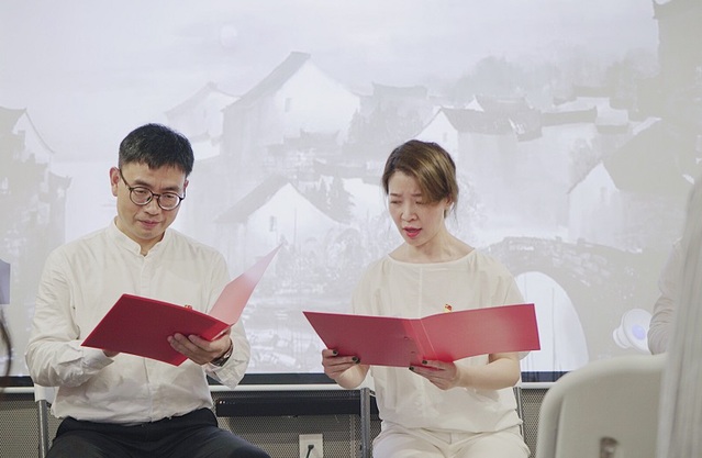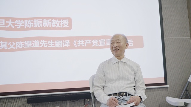 陈望道先生的儿子、复旦大学陈振新教授在聆听了四种语言的朗读之后,动情地介绍了父亲翻译《共产党宣言》的缘由、过程和产生的重大影响。随后,彭勇文、祁劭媛、李世涛、姚琨以剧本朗读的形式演出了话剧《陈望道》的第一幕“柴屋灯光”,该剧本由戏剧文学系黄溪教授编剧,“柴屋灯光”的剧情正是习近平总书记多次讲述过的故事,随着剧情的展开,真理的味道在陈望道旧居这间不足20平米的车库影院里弥漫开来,人们的思绪仿佛回到了1920年,看到了青年陈望道伏案译书的场景,情不自禁地跟着剧中人物一起高唱《国际歌》。