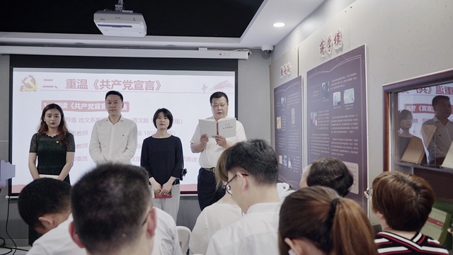 本次主题党日活动分为三个单元。第一单元是朗读《共产党宣言》,戏文系教师魏梅、易杰、刘颖、徐煜分别用德文、英文、俄文和中文朗读了这本红色经典的片段。“一个幽灵,共产主义的幽灵,在欧洲大陆徘徊……”,这段振聋发聩的文字感染着、激励着每一位在场的党员。