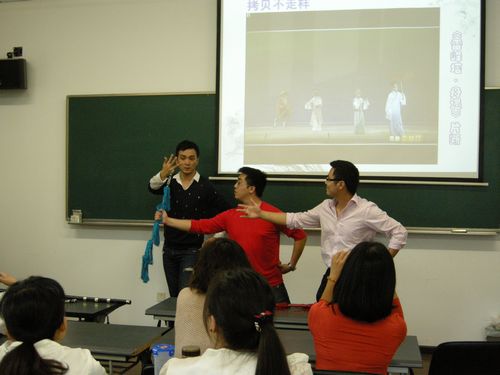 此外,在现场互动环节,黎安老师还邀请听课的同学上台学习了《牡丹亭·拾画》中定场诗的念法、《雷峰塔·舟遇》中上船身段的表演以及昆曲舞台上马鞭的使用等。同学们表现出极高的参与热情和模仿能力,跟着做了两三遍后便能独立表演所学内容。在轻松愉快的气氛中,同学们与昆剧有了一次近距离的接触。最后,同学们还在提问环节与黎安老师进行了昆曲有关知识的探讨。