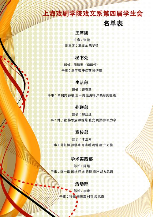 戏文系第四届学生会成员名单终确定。在经过了上学期的学生会委员会竞选确立主席团和各部部长人选之后,本学期开学伊始,我系学生会就投入到了新一轮的干事招新工作中。经过前期的个人简历投递自荐、现场招新面试综合评分、学生会委员会集体讨论等一系列程序之后,最终确定主席团和各部成员名单如下: