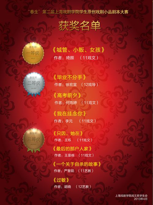 为提高学生原创剧本的积极性,配合表演系“纳海杯”戏剧小品大赛,由我系学生会组织的“春生”第二届上海戏剧学院学生原创戏剧小品大赛在四月顺利开展。此次大赛,不仅投稿作品众多,数量远高于第一届,更是除了我系同学的积极参与外,吸引了来自戏导、成教等多个专业院系同学的参与。经过评审,本次大赛评选出一等奖一名,二等奖三名,三等奖四名。