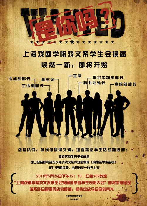 具体参与竞选职位有:主席,副主席(两名);宣传部,活动部,学术实践部,秘书处,外联部,生活部部长各一名。面向戏文系现学生会内所有干事,均可报名参加竞选。