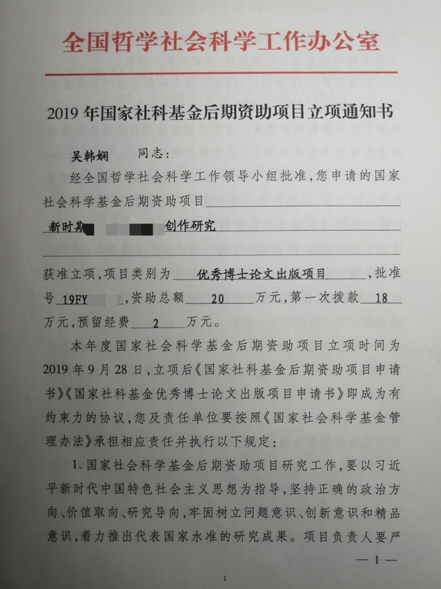 近日,我校2017届博士毕业生刘轩(导师:叶长海教授)、吴韩娴(导师:陆军教授)博士学位论文获2019年国家社科基金后期资助。2019年国家社科基金后期资助项目中艺术学共立项57项,其中重点项目2项,一般项目48项,优秀博士论文出版项目7项。