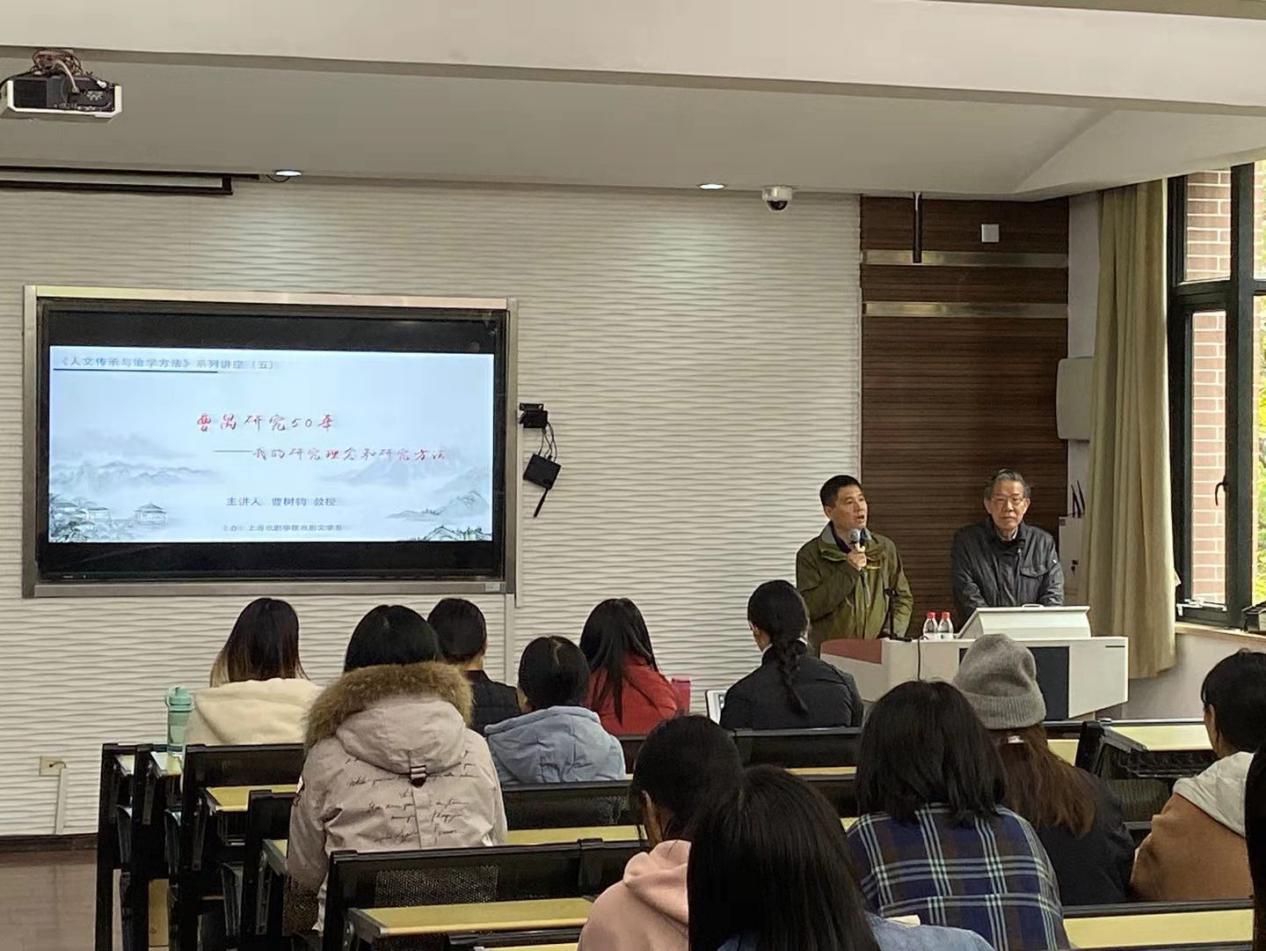 2019年11月28日下午,我系主办的《人文传承与治学方法》系列讲座(五)在红楼209教室拉开帷幕。本次讲座由戏文系主任陈军老师主持,并有幸邀请到我校戏文系退休教授曹树钧先生为同学们讲述《曹禺研究50年——我的研究理念和研究方法》。