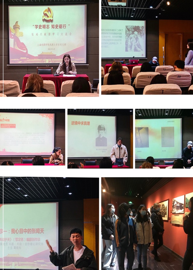 17级党员、戏剧(戏曲)创作理论研究博士生黄锐烁分享了他受戏文系党支部委托,创作剧本《声闻于天》时的感悟,并从张闻天的生平中提炼出了五个关键点:学习上聪慧过人、性格上低调谦逊、信仰上从善如流、真理上坚持追寻以及人格上完善自我。17级本科生党员汤斌着眼于张闻天的读书与创作历程,探讨了对新时代青年人的启发。19级党员、编剧学理论硕士生张丝雨以“逆境中求真理”为主题分享了从张闻天身上学到的精神:执着探索,追寻真理,不论在哪个年代,唯有努力学习钻研,才能给人民带来更好的作品。19级社会表演学硕士生陈婷从张闻天的生平简介、思想观念、实践探索以及对当代青年的启示这四个方面入手,讲述了张闻天的坚持与追求,认为青年人应该树立独立人格和高尚人格,为自己的理想奋斗到底,更要同群众们站在一起去实现理想。几位同学分享结束后,18级中国话剧史论硕士生朱一田和20级编剧硕士生魏小艳分别就张闻天的故事和精神呈现谈了自己的想法。朱一田同学从张闻天身上学到了“立志”的重要性,并认为确立志向要广泛学习吸收外界的知识和继承本民族的传统。魏小艳同学则认为拥抱挫折是追求真理过程中的良好品质。