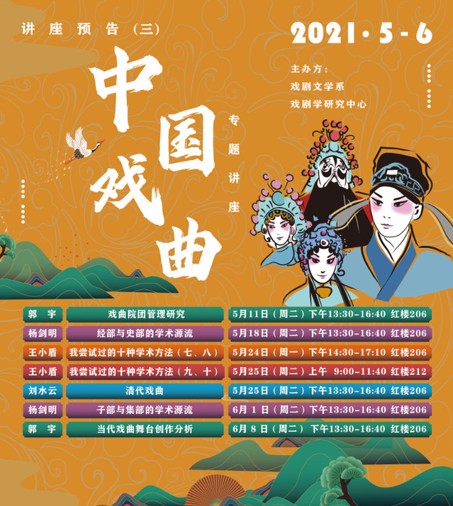 为进一步推进戏剧与影视学学科建设,构建多元化教育教学体系,以新的课程模式完善研究生培养质量,本学期,戏文系特邀校内外四位专家学者来“定制课程套餐”,共同为全院研究生开设一学期的《中国戏曲专题讲座》,从戏曲史、戏曲表导演理论、戏曲文献学与学术方法等多个角度,对戏剧学研究领域进行多层次解读,帮助学生夯实专业基础,开拓专业视野,增进专业交流,全面有效提升专业素养与学术水平。