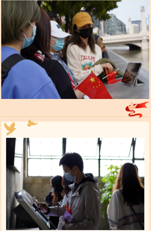 最后,同学们围站在苏州河畔集体观看了电影《八佰》的片段,并分享参观体会。