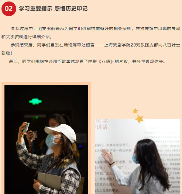 2021年4月15日下午,上海戏剧学院戏文系20级戏剧教育团支部来到四行仓库开展“红色基地打卡计划”第三站。抗日战争是中华民族和中国人民永远不能忘却的一段历史,步入新时代的青年们更应该深入了解那段充满硝烟和战火的血泪史,而发生在苏州河畔的那一场四行仓库保卫战,正是我们这一次去探寻的目标。