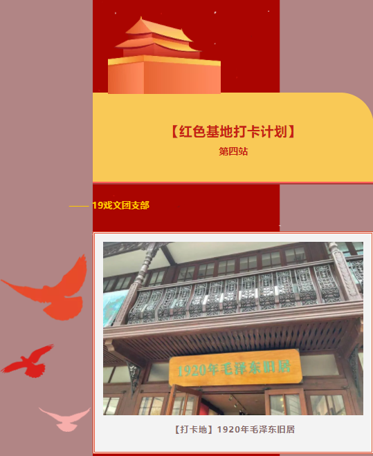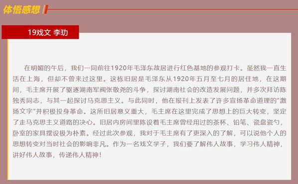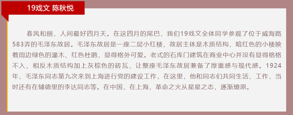 2021年4月23日下午,上海戏剧学院戏文系19级戏剧影视文学团支部的全体同学参观了上海1920年毛泽东旧居,开启“红色基地打卡计划”第四站。正值中国共产党中国共产党建党一百周年,回望过去“雄关漫道真如铁”,展望未来“乘风破浪会有时”,我们每一位青年大学生都要牢记初心使命,坚定理想信念,学习党史,从党史汲取经验,发展自我。