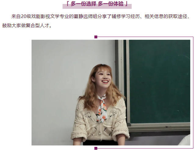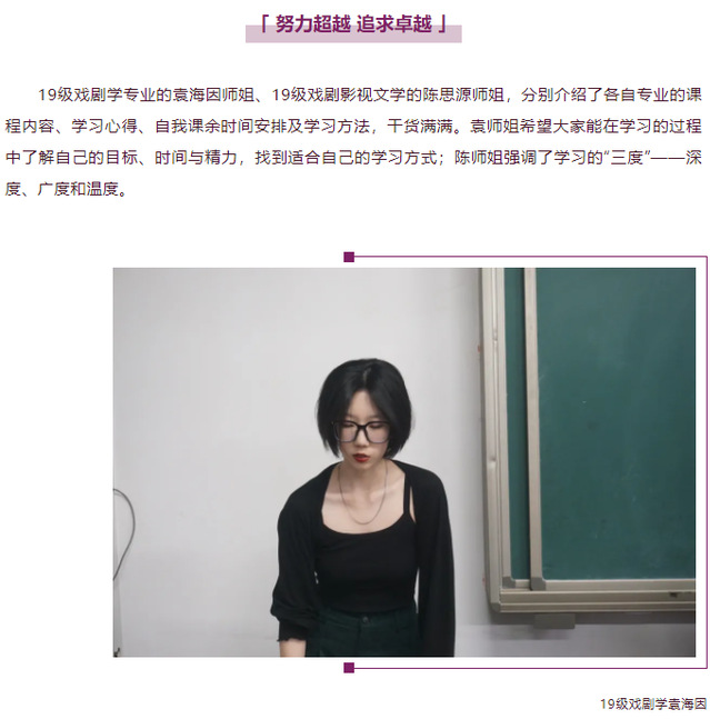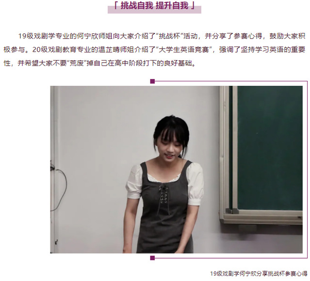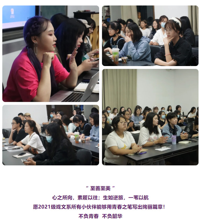 在本次戏文系新老生见面会上,我们认识了许多兼具“好看皮囊”与“有趣灵魂”的师哥师姐,他们的讲述让我对大学生活有了更多的向往与期待。或是找寻适合自己的学习方法事半功倍充满成就感;或是在自由的氛围里找到属于自己的道路;或是在学生会等学生组织中学会几项新的技能;又或者结识一些志同道合的伙伴,相扶相助,相伴而行……这些都让我对未来的四年充满信心。相信我们2021级的戏文新生能够实现自己的理想,展现上戏戏文风采,努力成为人类灵魂的青年工匠!