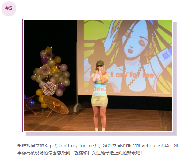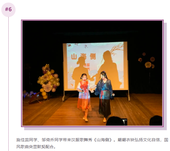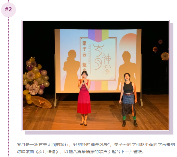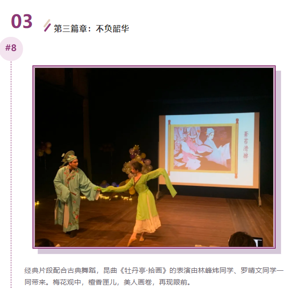 整场晚会共分为“风华正茂”、“上下求索”、“不负韶华”三个篇章,包含了器乐演奏、对唱、舞蹈与昆曲表演等节目形式,其间穿插了抽奖互动环节,在惬意氛围里带来极佳的视听享受。