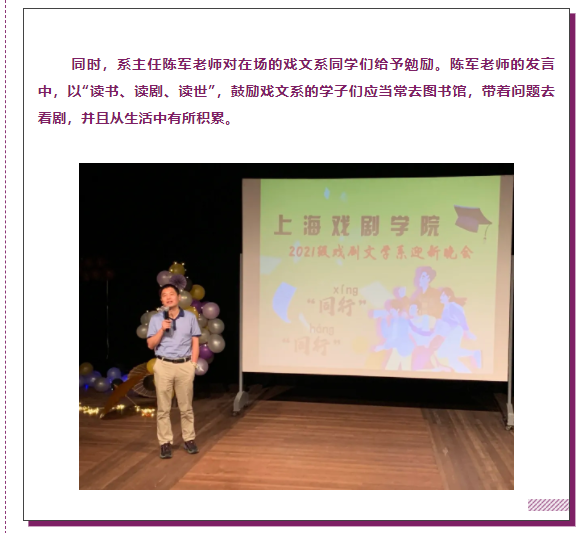 今夏,戏剧文学系迎来了48位本科新生、79位研究生新生(硕士生58人、博士生21人),组成共127人的新生大家庭,本次迎新晚会由戏文本科生和研究生携手举办。出席本次迎新晚会活动的有戏文系系主任陈军老师、系党总支副书记陈莹老师、21级戏文班班主任吴韩娴老师、21级戏剧学班主任李冉老师、兼职辅导员韩爽老师、研究生辅导员刘莹莹老师、本科生辅导员管润青老师。
