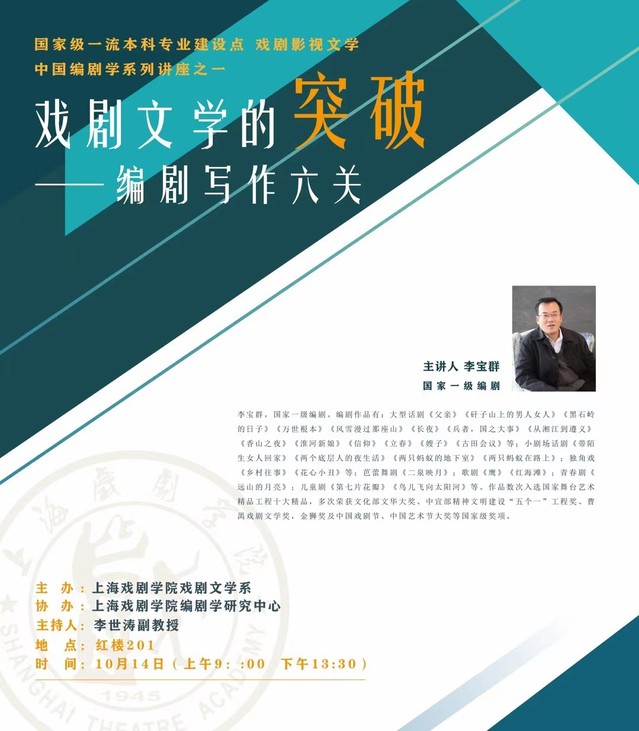 2021年10月14日上午,戏文系主办的中国编剧学系列讲座正式开讲,首次讲座邀请了国家一级编剧李宝群老师,题为《戏剧文学的突破——编剧写作六关》。讲座由李世涛副教授主持,戏文系的青年教师、本科生和研究生聆听了此次讲座。