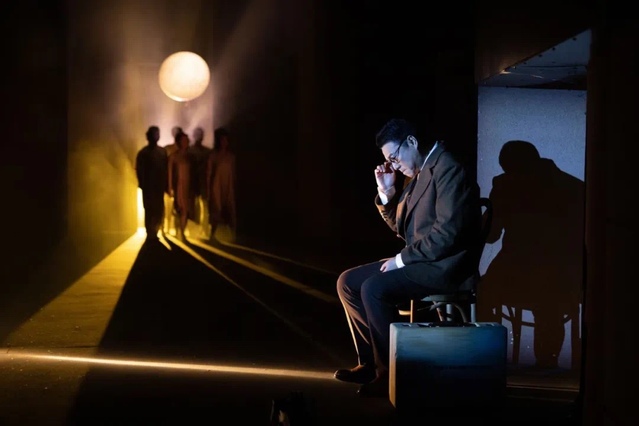 犹豫过,但删掉所有移民官的台词时,爽利极了。摆脱了一问一答式的“冲突”和激化矛盾,摆脱了译制片式的翻译腔,也更易于进入邬达克的内心世界和回忆时空,他的言语是回答,是有交流对象的,但呈现在舞台上的,类似于独白。审问者的缺席,使得“审问”本身更加莫名其妙、不可理喻。