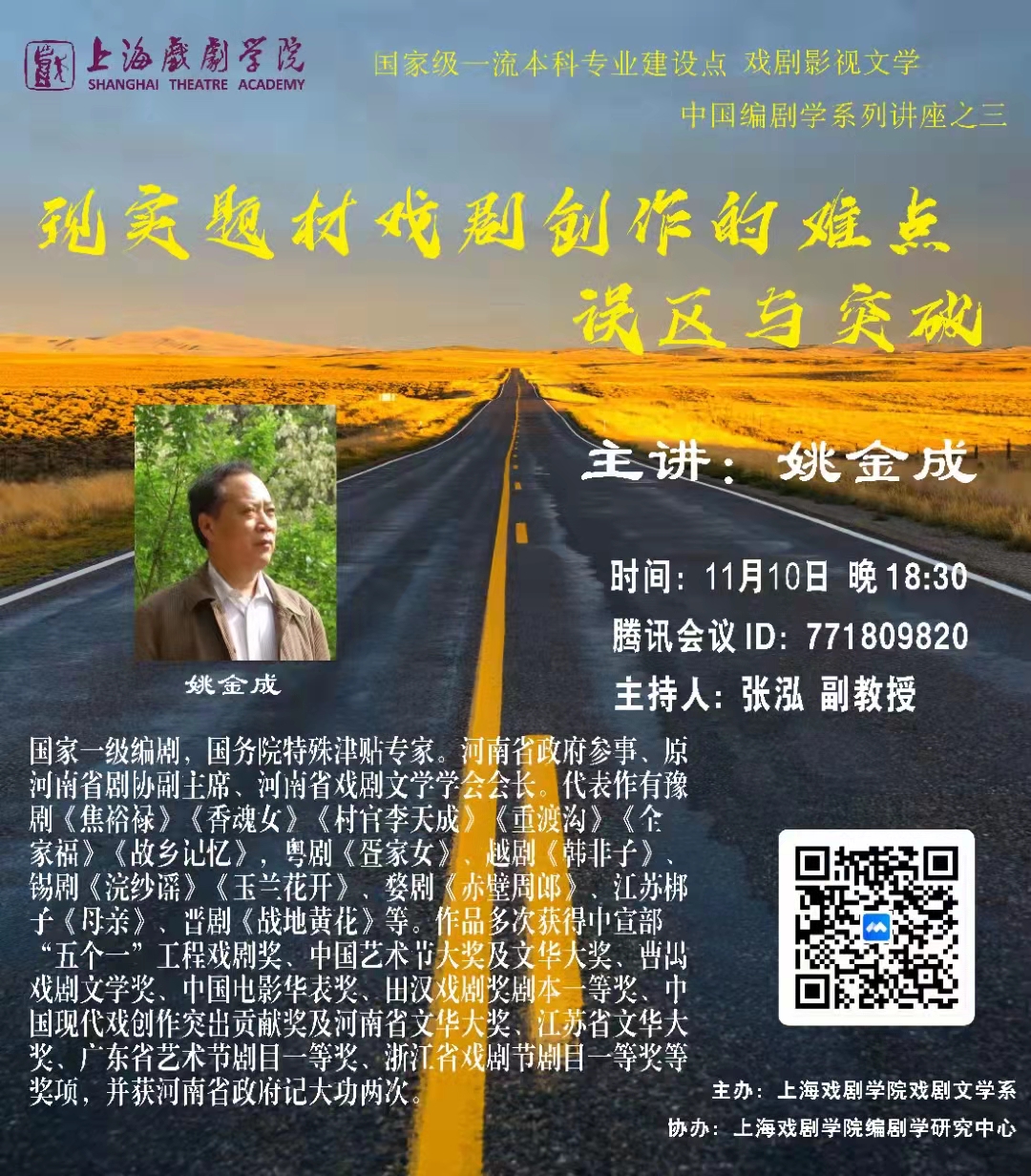 2021年11月10日晚六点半,戏文系主办的“中国编剧学系列讲座”三度开讲。本次讲座邀请了国家一级编剧姚金成,题为《现实主义创作的难点与突破》。讲座由张泓副教授和李世涛副教授主持。本次讲座采用了线上视频的方式,吸引了全国各院团和各高校的老师、同学及教授、学者等,逾百人聆听了本次讲座,大家通过线上留言、在线互动等方式进行了一次别开生面的线上交流,可见疫情的影响也丝毫没有磨灭师生们向专家汲取知识的热情,甚至拉近了全国院校之间的地域距离,愈发扩大了本系列讲座在全国范围内的影响力。