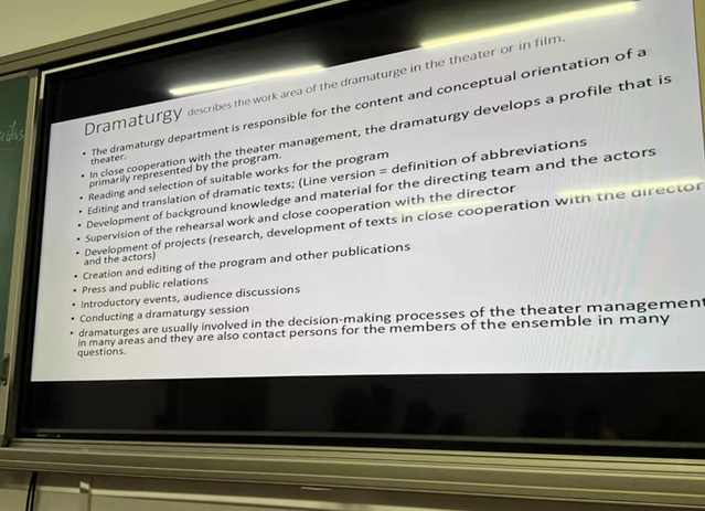 课程的结尾部分,老师向大家分享了一则戏剧构作职位的招聘文章,向同学们介绍了戏剧构作所需要的技能以及职责范围,如:了解当代及经典戏剧作品、关心当下时事、具有较好的写作能力、合作意识等,在剧场中则需要负责演出安排、选择适合的戏剧作品并进行编辑翻译、为创作准备所需的背景及相关资料、参与排练并与导演深入合作、面向公众宣发、引导观众进行思考和表达等。通过阅读招聘文章,同学们对戏剧构作的职责有了更加真切的认识,也同时看到了未来可能规划的职业方向,使在座的同学们收获良多。他们对接下来的课程学习表现出浓厚的兴趣。