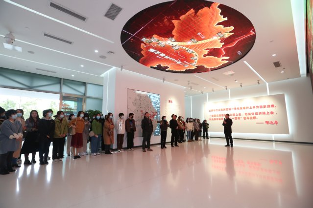 本次活动共分为四项内容。第一项是参观长三角G60科创走廊规划展示馆。G60走廊是落实长三角一体化发展国家战略的重要平台,是一条中国制造迈向中国创造的先进走廊,是科技和制度创新双轮驱动的先试走廊,是产城融合发展的先行走廊。它以上海松江为策源地,以苏浙皖沿线的9个城市为科创产业集群,优势融通、协同发展,为高质量的区域一体化发展发挥引擎与示范作用。其中当然离不开党建引领,“把党组织建在产业集群上”是其重要思想指引,不断将政治优势、组织优势转化为发展优势。师生党员们一边认真聆听工作人员对科创走廊发展历程、规划目标、科创成果的细致介绍,一边饶有兴致地感受体验前沿科技给工作生活带来的各种便利,更深深被新时代中国科创工作者的崇高志向和民族气慨所动容和鼓舞。