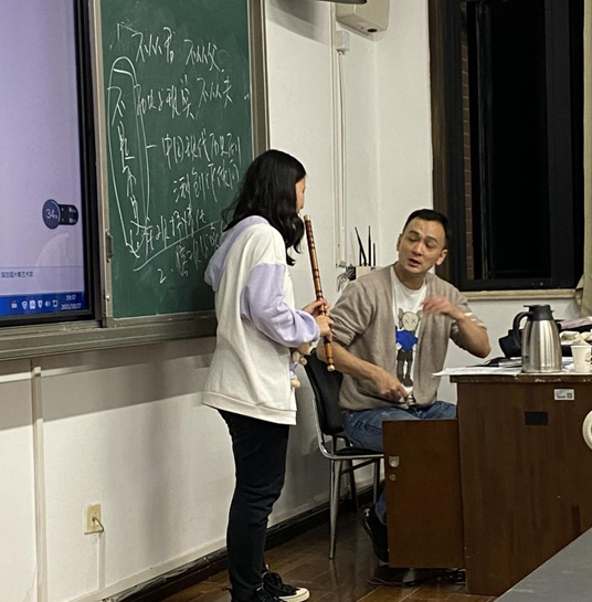 拍习时,黎安老师首先带领同学们逐字念诵曲词,学习昆曲的咬字发音;其后帮助同学们熟悉曲调,最后完成演唱。黎安老师还与同学们分享了自己学曲和演出的经验,细致分析了吕洞宾的表演特点,带领同学反复练习,强调细节处理和感情把握,使演唱更贴近人物,充分表现曲情曲意。