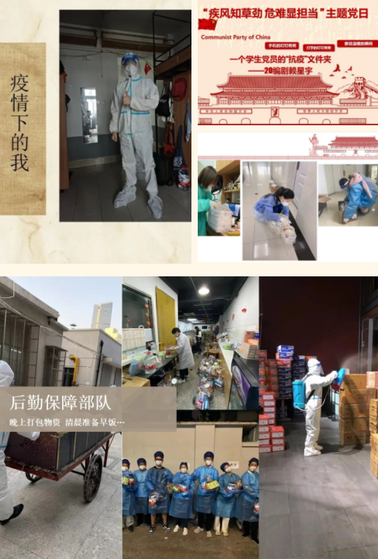 增强信仰支撑,传递志愿精神。党员王育涵、赖星宇及入党积极分子禹尚驰三位同学分享了他们身边的抗疫人物与故事。在分享中,王育涵同学用一张张志愿者图片记录并诉说着那些与老师、同学们并肩作战的日子,“坚忍不拔有耐心”是她以奉献换来的收获。赖星宇同学用电脑里的一个个工作文件夹,讲述了志愿服务的点点滴滴,以行动践行着学生党员肩上沉甸甸的责任。禹尚驰同学的一句“面具下的我是谁并不重要,重要的是我的所作所为。”道出了新时代青年的责任与担当。无论是研究生还是本科生,他们始终秉持着“志”在心中,“愿”在行动的旗帜,尽微薄之力,不负韶华,不负青春,共战疫!