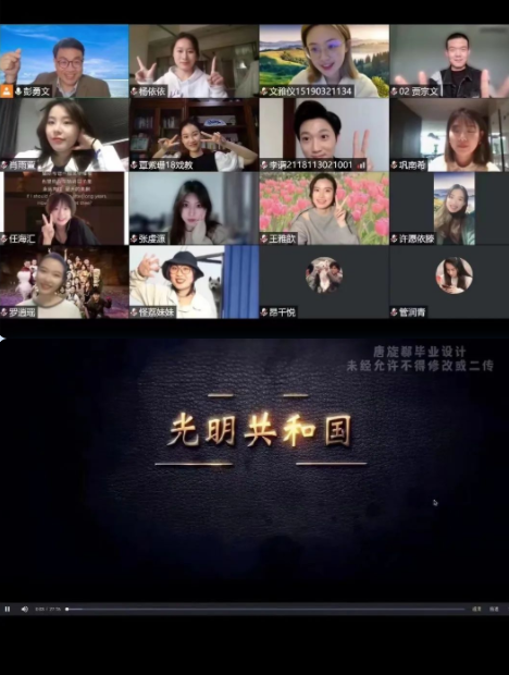 4月29日下午,紧接毕业论文答辩,18级戏教班迎来了一场具有特殊意义的班会。在这场班会中,同学们虽身处全国各地,但共同在云端分享了疫情期间的所感所思,以及对未来的规划与打算。在线上,同学们一起观看了毕业大戏《光明共和国》创作排演过程的纪录片,回忆了在一起奋斗、共享苦辣酸甜的点滴时光。最后,陪伴了我们四年的班主任彭勇文老师也为全班同学送上了美好的寄语,希望同学们都能带着美好的祝福走向更光明、更广阔的未来。