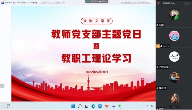 在线下自学的基础上,2022年5月20日中午,戏文系于腾讯会议室里组织召开了主题为“奋斗者正青春”的教师党支部主题党日暨教职工理论学习活动。会上,教师党支部三名支委委员分别就上述内容做了提纲挈领的要点导读,与支部全体党员和全系教职工一道展开了学习交流。