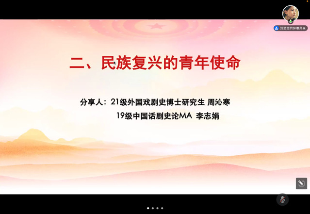 2022520日晚1900,上海戏剧学院戏剧文学系学生第一党支部、第二党支部在腾讯会议线上平台举行争做堪当民族复兴重任的时代新人主题党日活动暨毕业生党员离校教育。本次活动邀请刘明厚教授发表主题演讲,戏文系党总支副书记陈莹老师、学生第二党支部书记刘莹莹老师、学生第一党支部书记管润青老师与学生党员、入党积极分子参与会议,主题党日活动由刘莹莹老师主持。